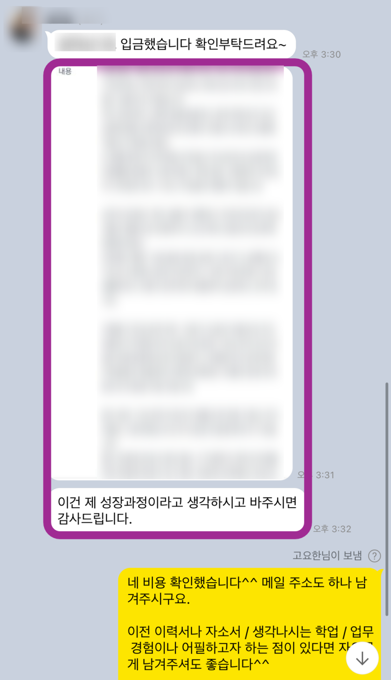 다음으로, 각 문항별로 구체적인 작성 방향을 제시하고, 지원자분의 경험을 바탕으로 스토리를 구성했습니다. 문장 하나하나, 단어 하나하나 꼼꼼하게 첨삭하면서 완성도를 높였죠. 진짜 이건 거의 대필 수준으로 갈아엎었어요! 고객님이 전에 쓰셨던 자소서를 들고 오셨는데, 글자 수도 안 맞고 문장도 그대로 첨삭하면서 거의 다시 짰다고 봐야 해요 제발 다음엔 하루 전에는 와주셔요..! 진짜 그래야 저도 여유 있게 도와드릴 수 있거든요