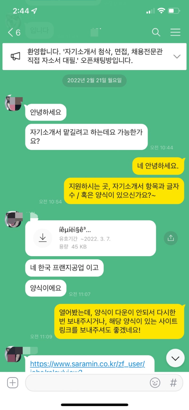 - >> 자료 전달: 채용공고, 자기소개서 초안, 이력서 등 관련 자료 전달