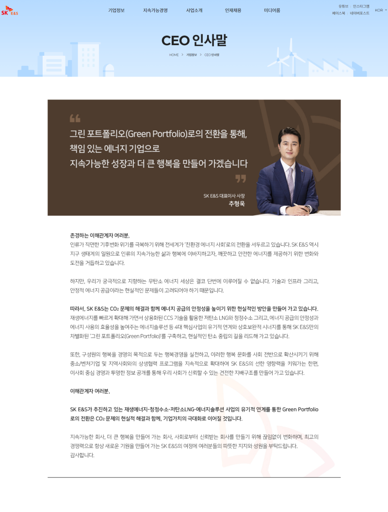 SK E&S는 **’Green Energy & Solution Provider’** 비전 아래 친환경 에너지 전환을 선도하며 지속가능한 미래를 만들어가는 기업입니다. 💡